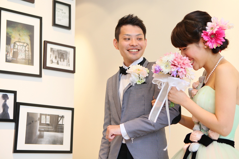 当店では珍しい、チェックのタキシードとカラードレスをお選び頂きましたが、本当にお似合いでした!