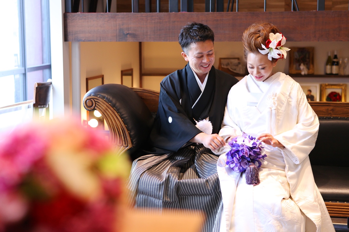 ヘアメイクも挙式では、ナチュラルな雰囲気に、アトリエ和装撮影では、かっこいい雰囲気に。