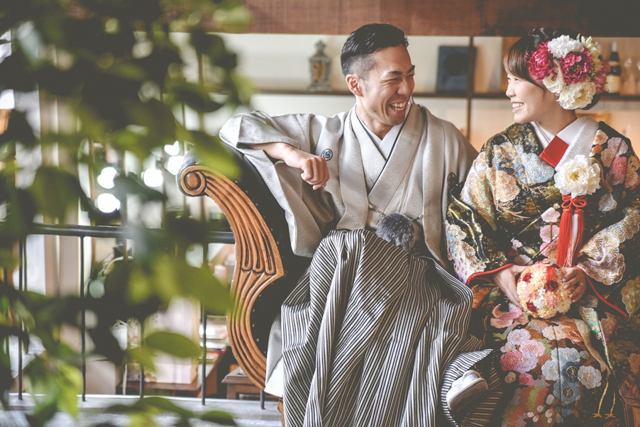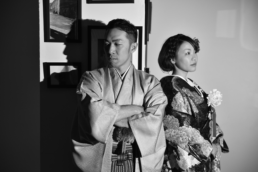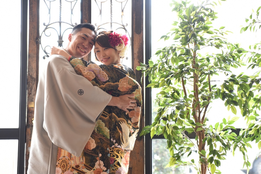 お二人ともお選びいただいた和装がとてもお似合いでした。グレーの紋服を上品に着こなし、和モダンなブラック交じりの色打掛をかっこよくも、かわいくも着こなしてくれた新婦さま。