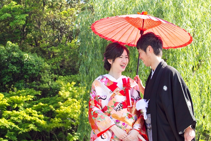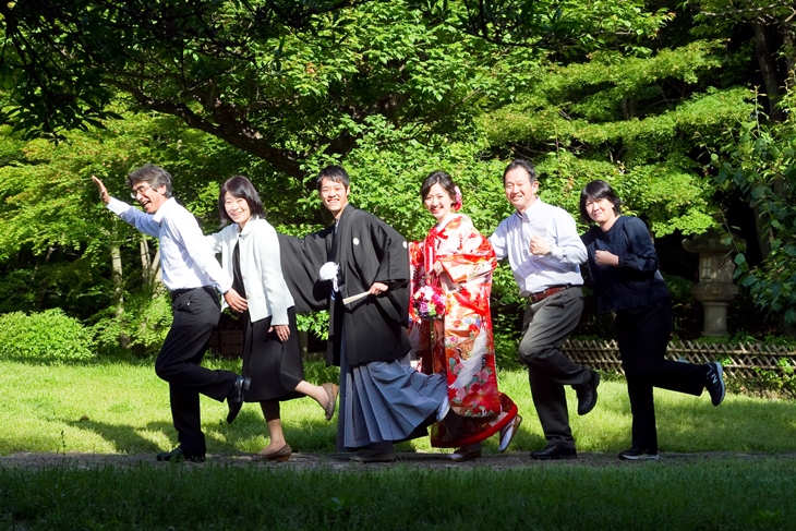 和装は徳川園で、洋装はアトリエスタジオ ウェディングアベニューで撮影して頂きました。和装は新緑をバックに家族で並んで撮ったり、日本庭園の大自然をバックに、暖かいイメージのお写真に。
