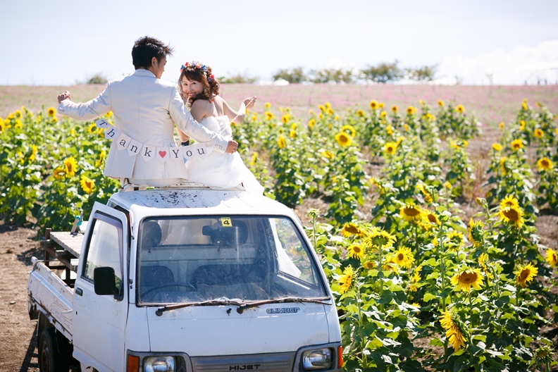 そして、軽トラックに乗って撮影!ひまわり畑と合いすぎてます笑これから続く長い道のりが、おふたりにとってひまわりみたいに明るく輝きますように☆