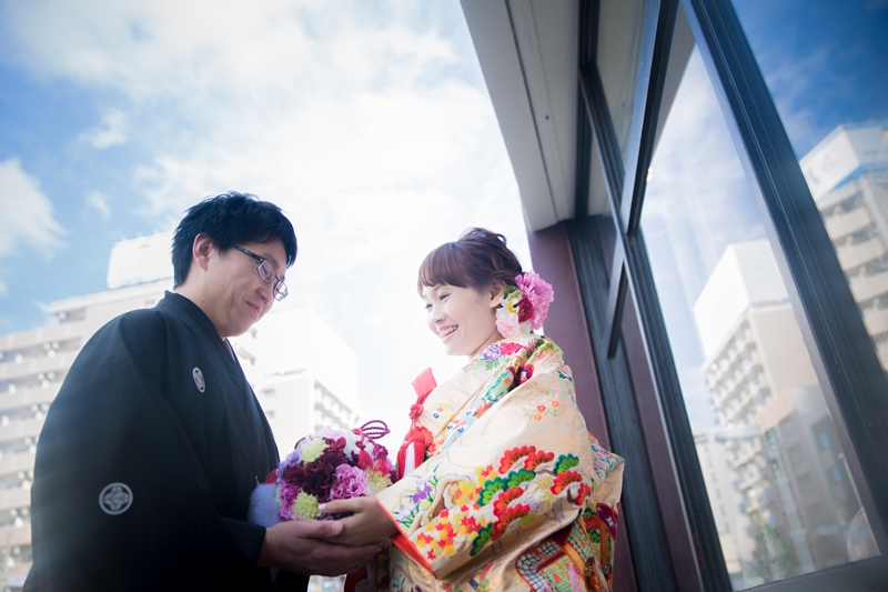 白無垢と色打掛の2着着て頂き、色打掛では洋風のヘアスタイル、白無垢ではご自分の髪で日本髪を結ってとても素敵でした。